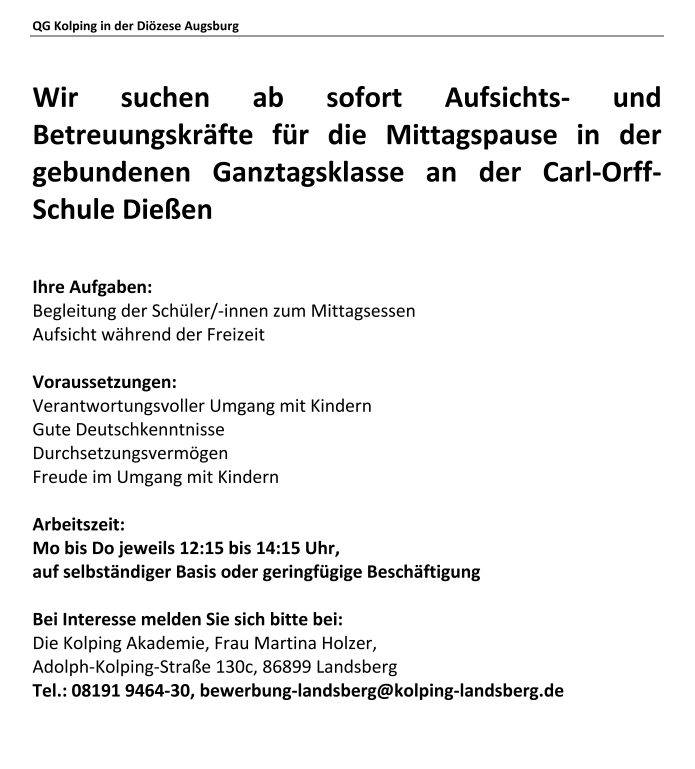 es freut mich, Sie auf der Homepage der Carl-Orff-Grund- und Mittelschule begrüßen zu dürfen und Ihr Interesse an unserer Schule zu sehen. Unsere Schule, mit über 700 Schülerinnen und Schülern sowie 74 Lehrkräften, zählt mit zu den größten Grund- und Mittelschulen im Regierungsbezirk Oberbayern. Unser Einzugsgebiet umfasst - neben der Marktgemeinde Dießen - die Gemeinden Eching, Ersesing, Greifenberg, Hofstetten-Hagenheim, Schondorf und Windach.