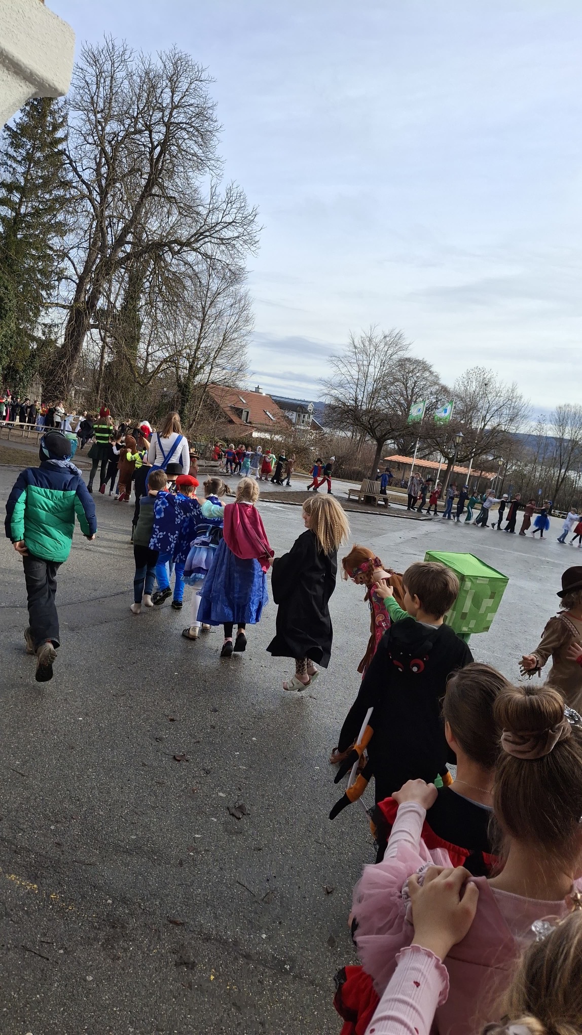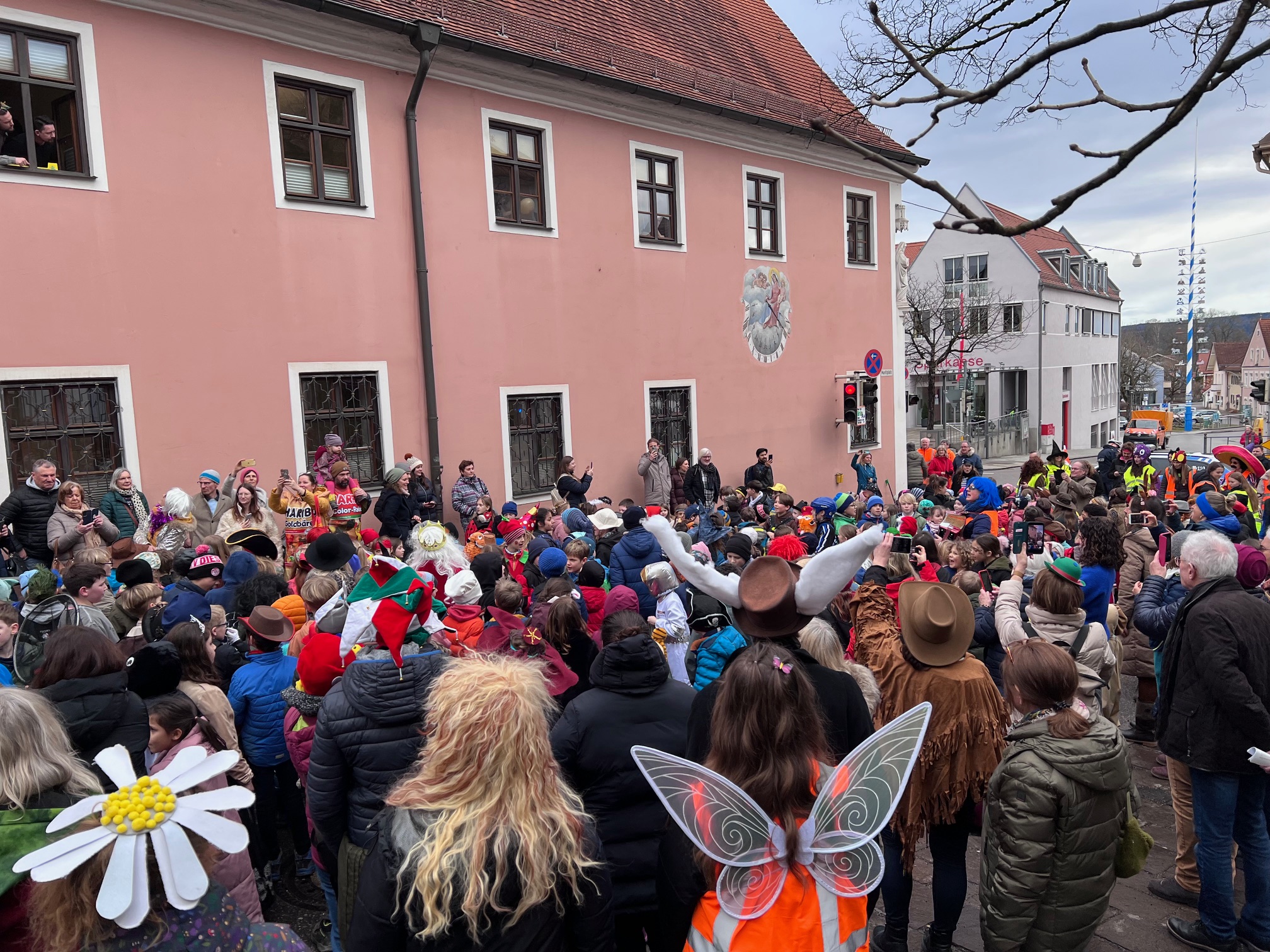 Um 11:00 Uhr machte sich die Schulgemeinschaft auf den Weg zum Faschingsumzug in Richtung Rathaus. Dort wurden die Kinder herzlich von Bürgermeisterin Sandra Perzul und Schulleiter Michael Kramer empfangen. Ein besonderer Höhepunkt für die Kinder war der gemeinsame Bonbon-Regen, der für große Begeisterung und viele strahlende Gesichter sorgte.